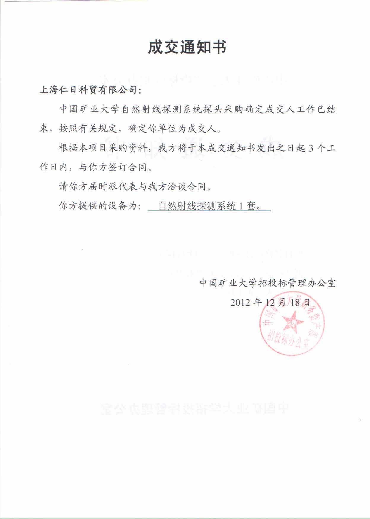您的位置:首页>>企业新闻详细信息我公司中标中国矿业大学(射线探头定制)项目